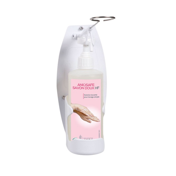 Le distributeur mural PVC Anios est conçu pour les flacons à pompe de 500 ml. Il se compose d'une plaque murale polyvalente et d'un support adapté au conditionnement. La plaque polyvalente est fixée avec deux vis ou collée avec du ruban adhésif double face. Le désinfecter régulièrement pour minimiser les infections bactériennes.