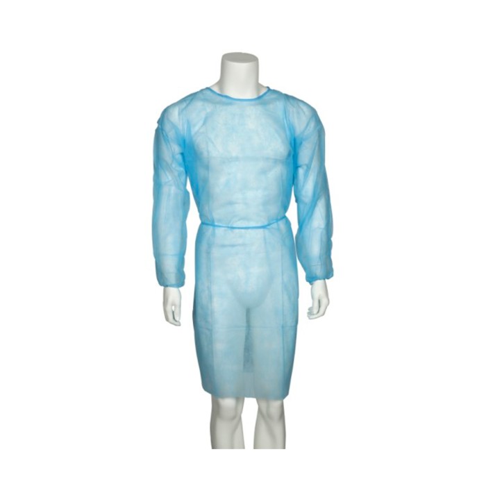 Blouse jetable bleue transparente, manches longues avec poignets élastiqués, fermeture dorsale. Idéale pour le secteur médical et les visiteurs. Lot de 10 blouses.