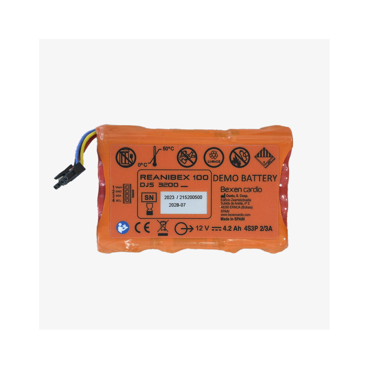 Batterie de démo LiMnO2 Bexen Cardio pour formation au Reanibex 100. Compatible électrodes clip, simulation via application mobile, nécessite ECG et simulateur de choc.