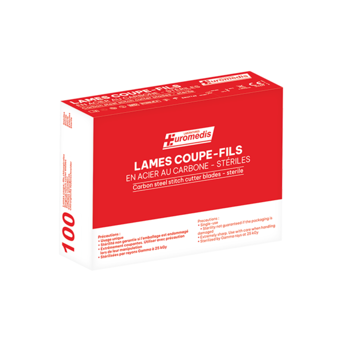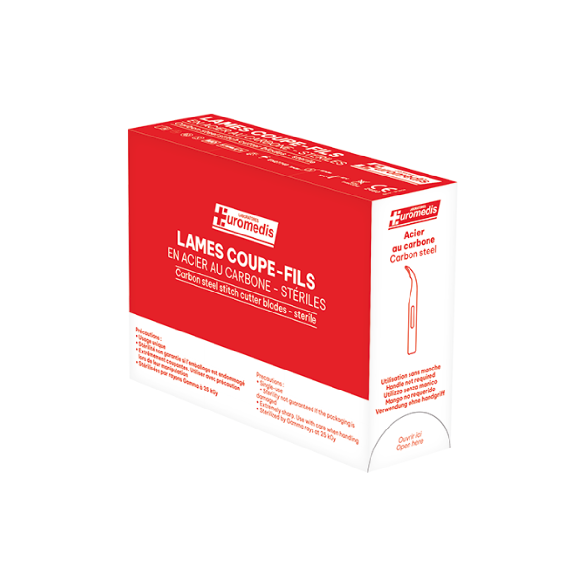 Lames coupe-fils stériles Euromedis à usage unique, extrémité arrondie, sécurisées et compatibles avec ou sans manche de bistouri, boîte de 100 unités.