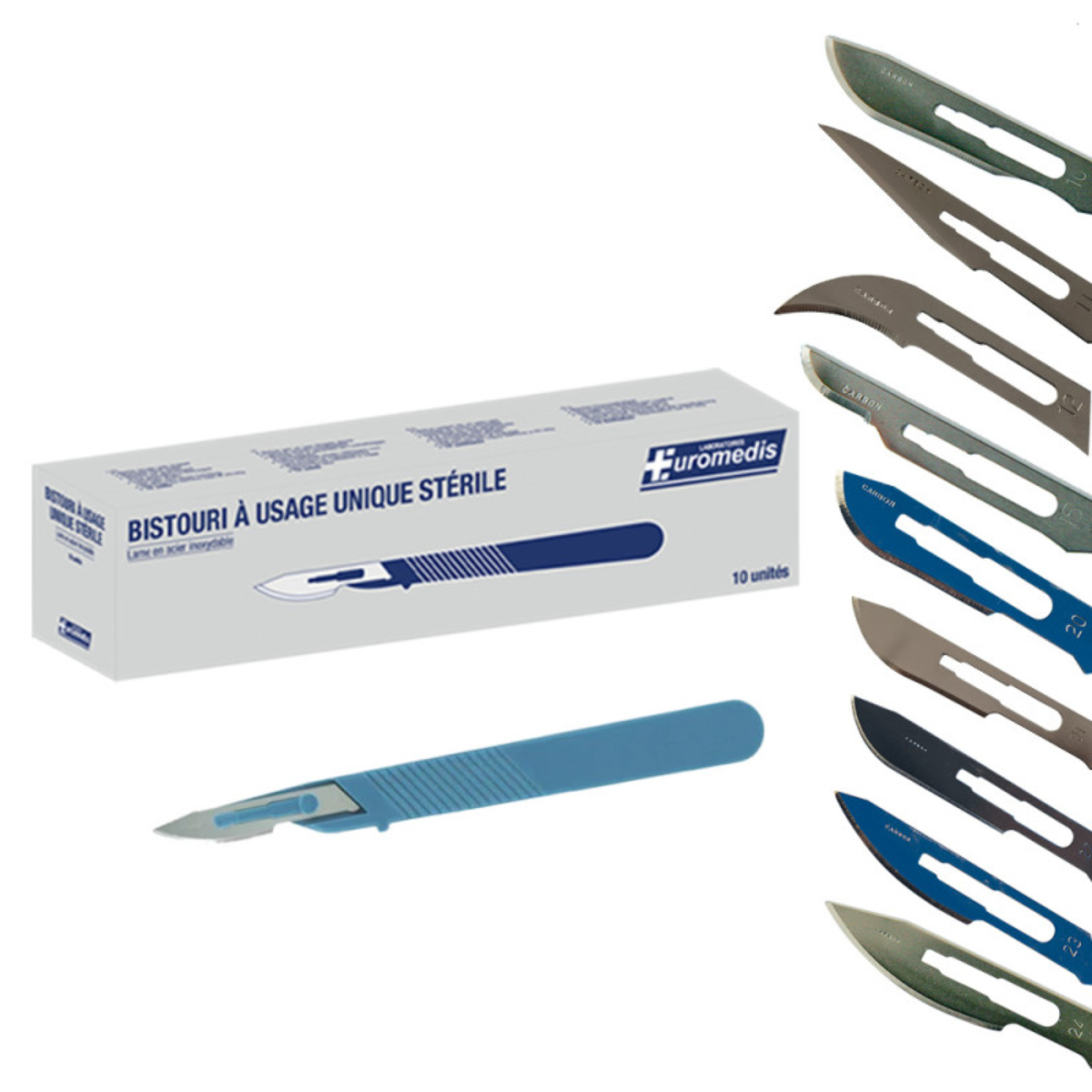 Bistouri stérile à usage unique Euromedis avec lame en acier inoxydable et manche ABS bleu ergonomique. Conçu pour des incisions, dissections et retrait de tissus avec précision, il est conditionné individuellement et prêt à l’usage. Adapté aux interventions générales, il est déconseillé en chirurgie cardiaque et ophtalmique.