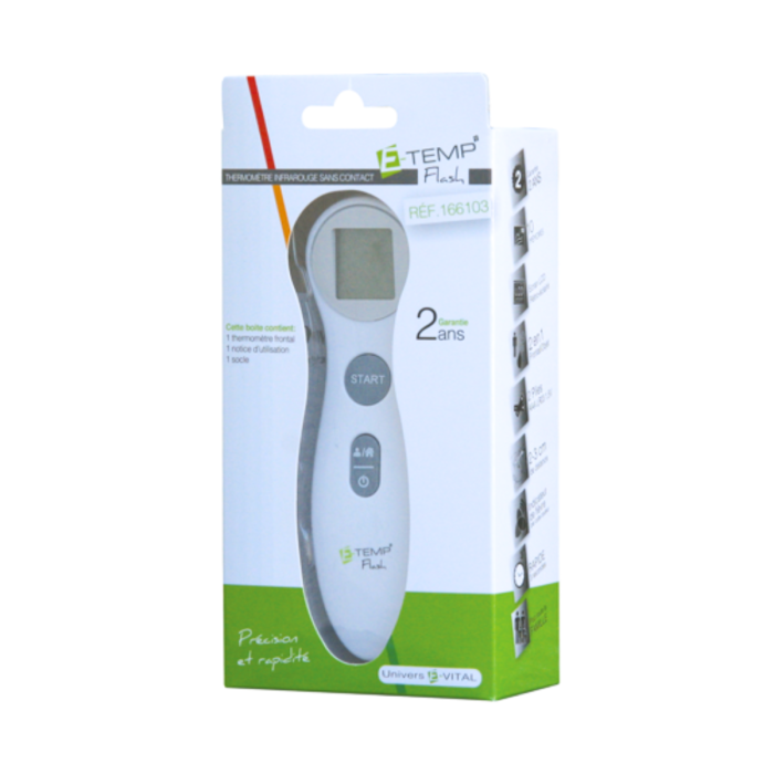 Le thermomètre infrarouge frontal sans contact E-TEMP FLASH permet une prise de température rapide, précise et hygiénique. Grâce à sa technologie infrarouge, il mesure la température corporelle sans contact direct, ce qui limite les risques de contamination et facilite son utilisation auprès des adultes comme des enfants.
