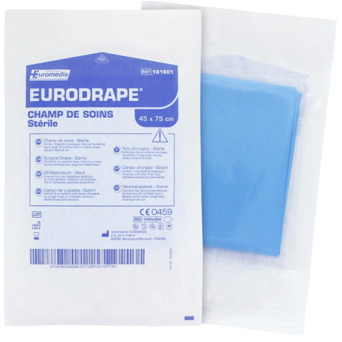 Les champs de soins stériles EURODRAPE sont conçus pour la petite chirurgie et les soins particuliers. Chaque champ est composé d’une feuille opaque en polyéthylène doublée d’une feuille absorbante en cellulose (grammage 57 g/m²), offrant une protection efficace pour le patient et l’utilisateur.