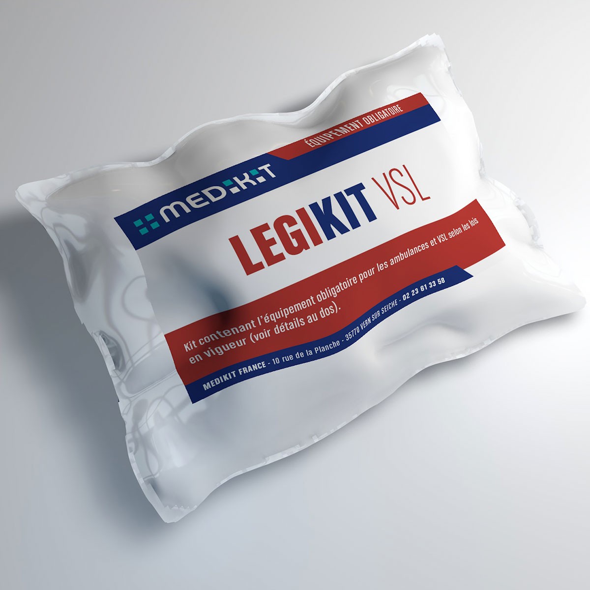 Kit d'urgence renfermant le matériel nécessaire conformément à la législation en vigueur pour les ambulances et les VSL. Décret N°87-965 du 30 novembre 1987 et arrêté de mars 1990, annexe 1, paragraphe 3. Conforme aux arrêtés du 10 février 2008 / 28 août 2009 et 12 décembre 2017.